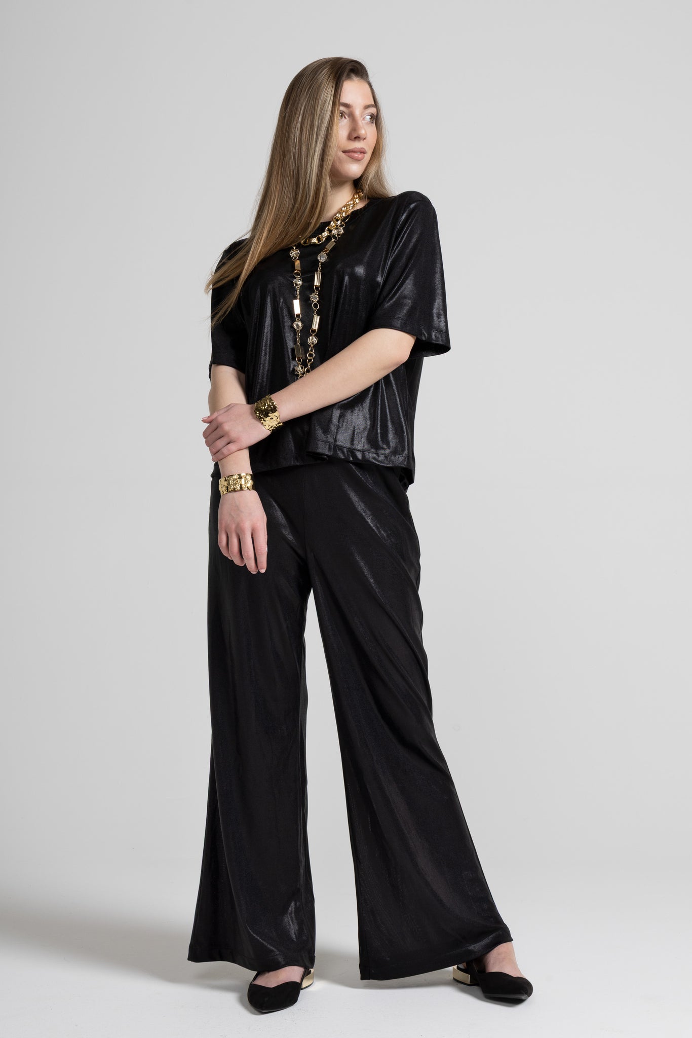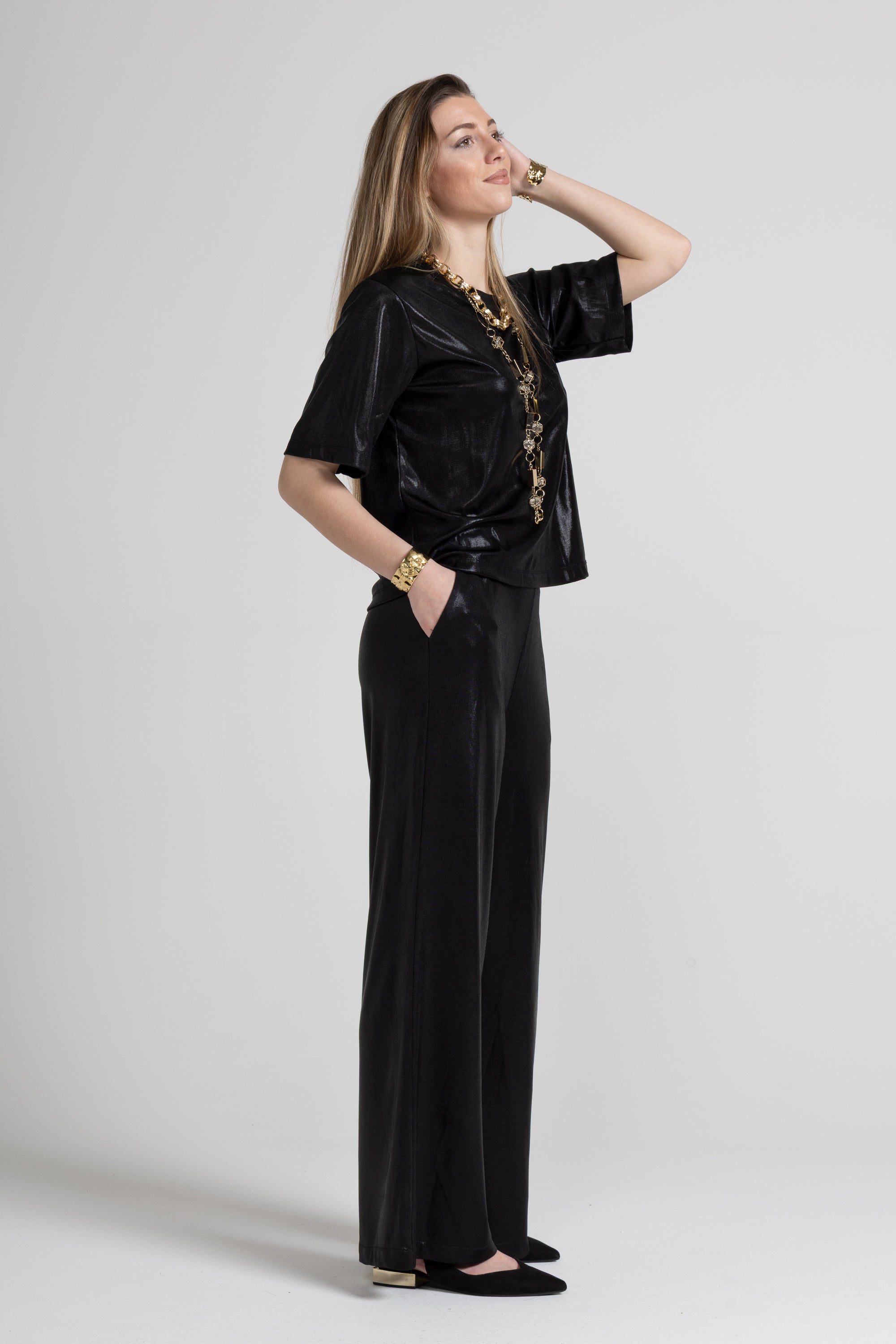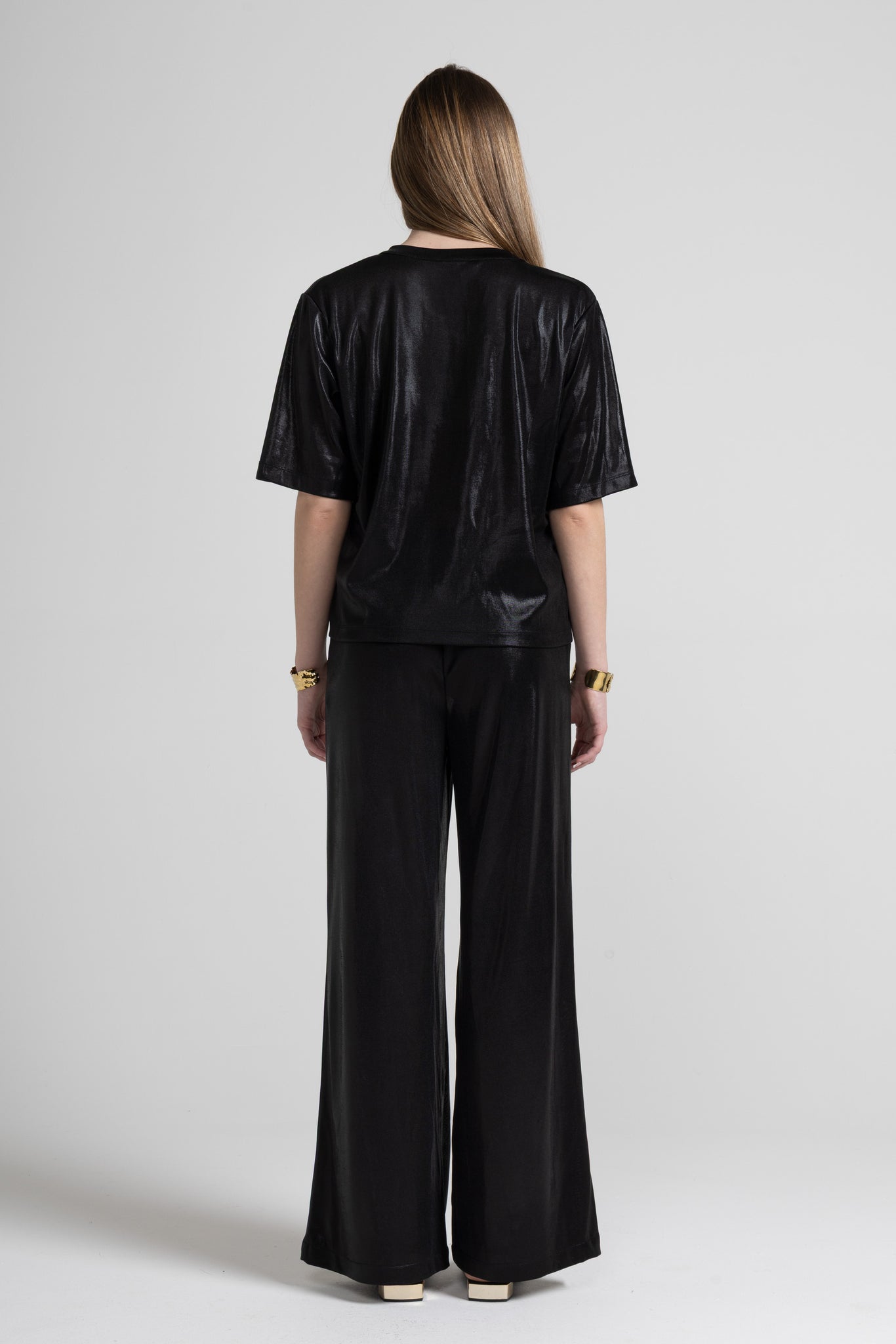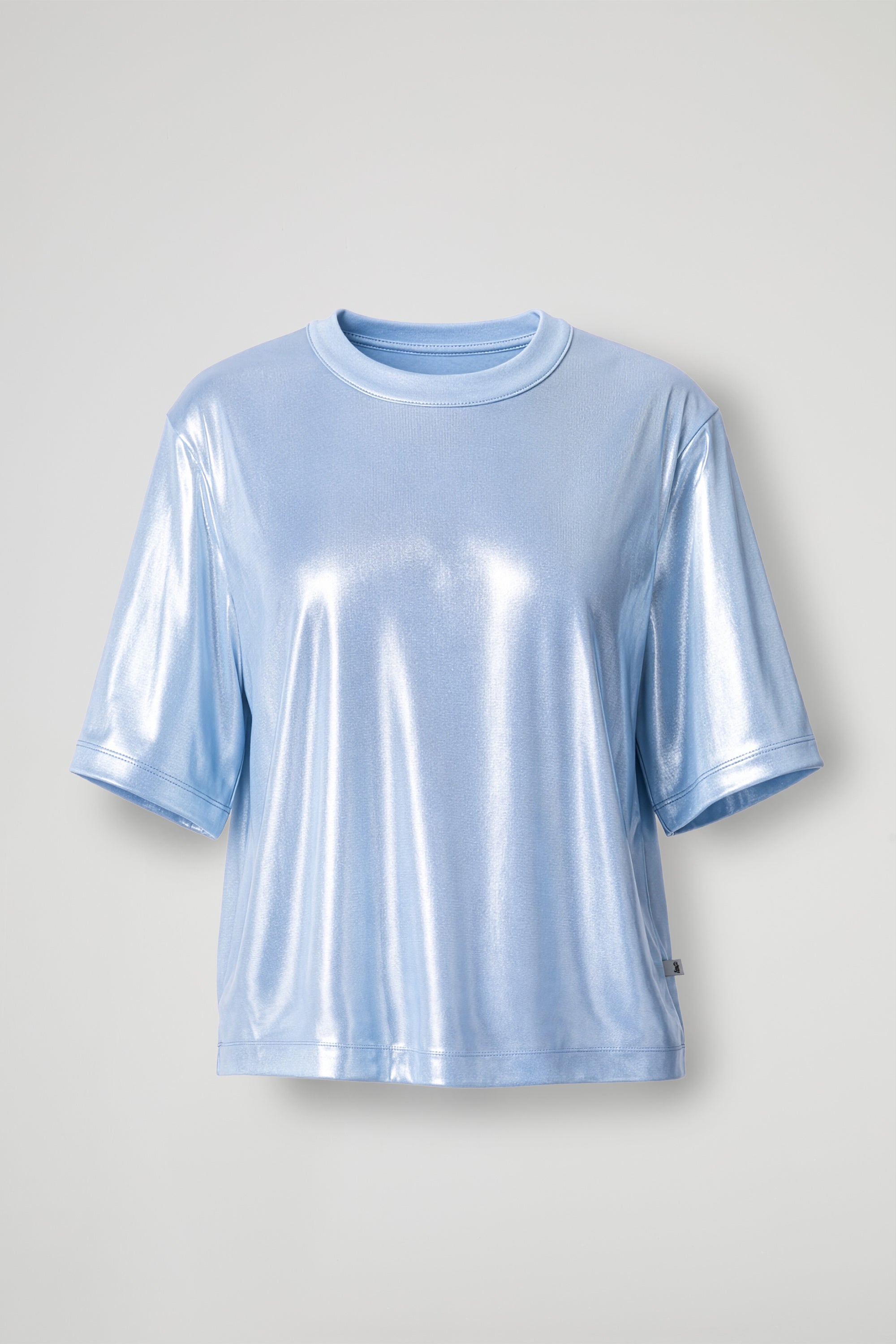T-Shirt effetto laminato, un tocco glow che illumina subito il look, morbida, comoda e scenografica: linea over, manica ampia e scollo girocollo per un fit easy, mentre la finitura brillante dà carattere anche all’outfit più semplice.
