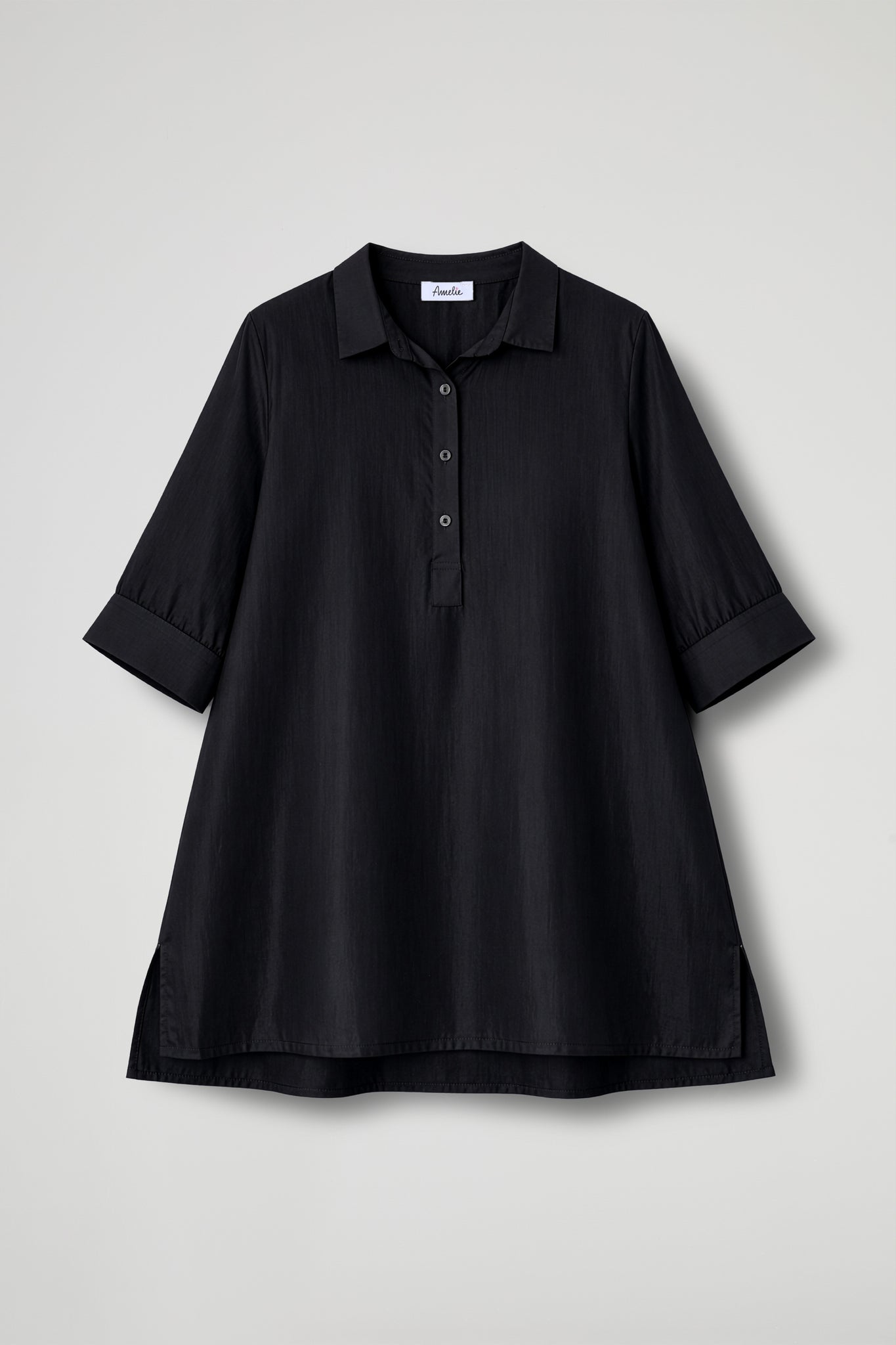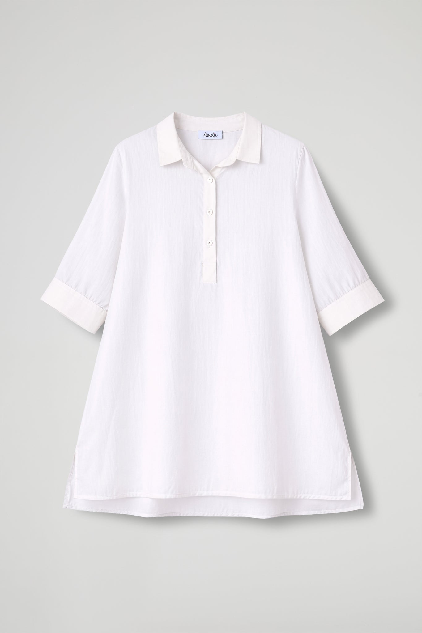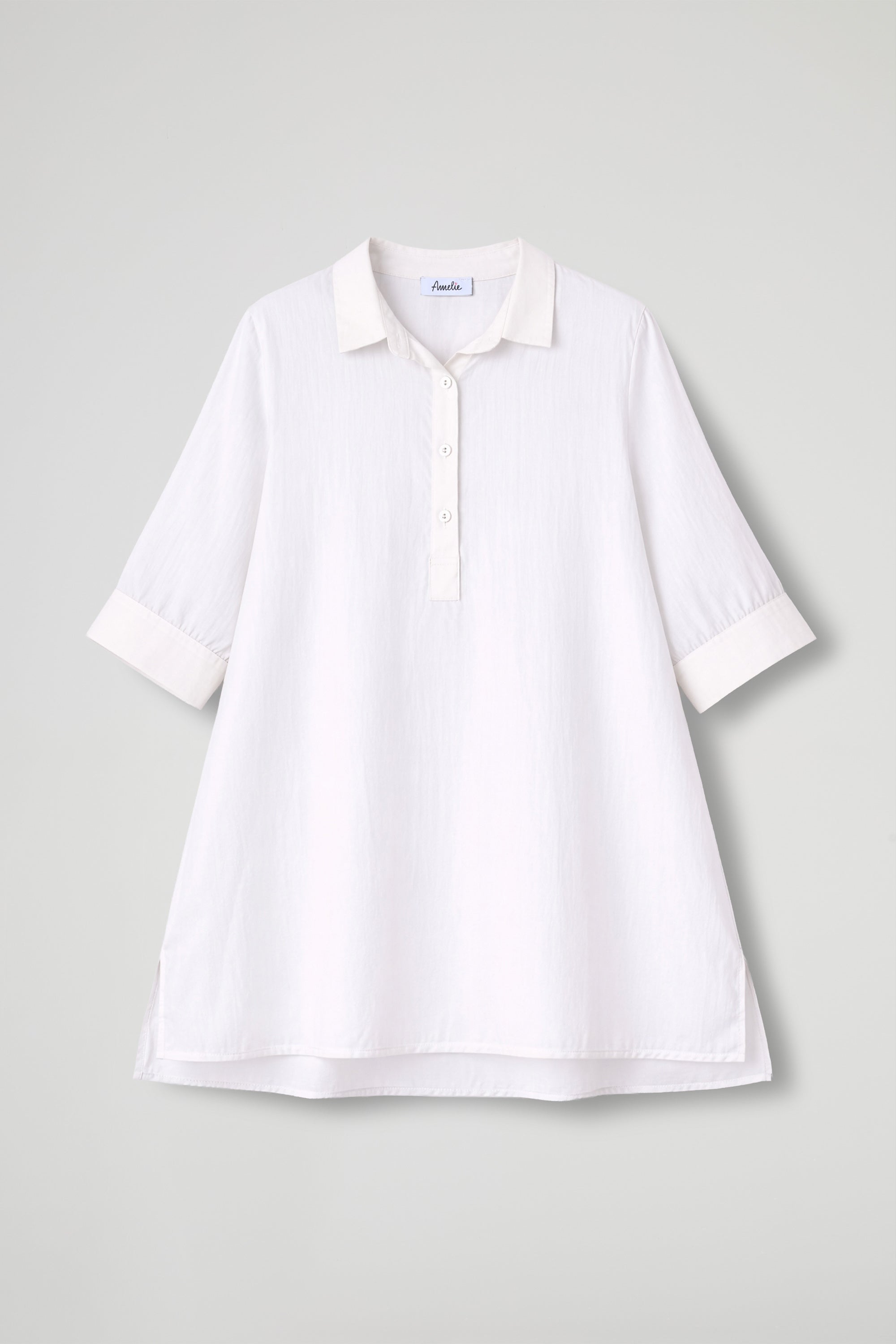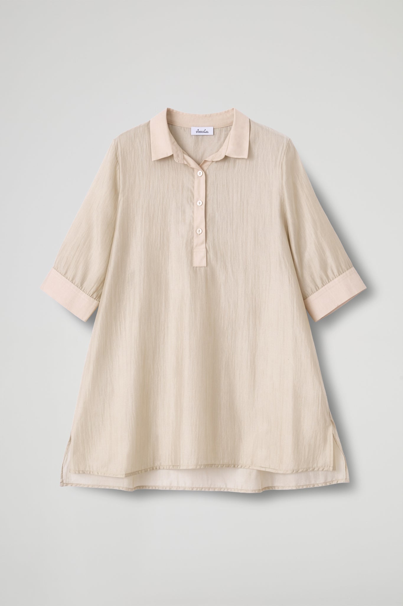 Camicia over dal gusto essenziale e raffinato, realizzata in tessuto leggero e semi-trasparente che dona luminosità e un effetto super femminile. Il design pulito è valorizzato dal collo classico e dalla chiusura a polo con bottoni tono su tono, mentre le maniche a 3/4 con polsino rendono il capo pratico e versatile. Il fondo dritto e gli spacchetti laterali completano la linea morbida, perfetta da indossare sia dentro che fuori dai pantaloni.