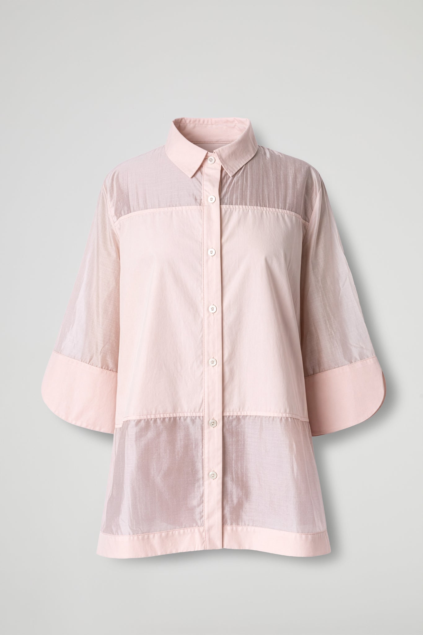 Camicia morbida in tessuto di cotone, colletto classico, manica 3/4 ampie con maxi polsino con taglio a petalo e orlo rifinito, chiusura frontale con bottoni, dettaglio pannelli trasparenti orizzontali, orlo ribattuto su fondo. linea dritta e vestibilità morbida.