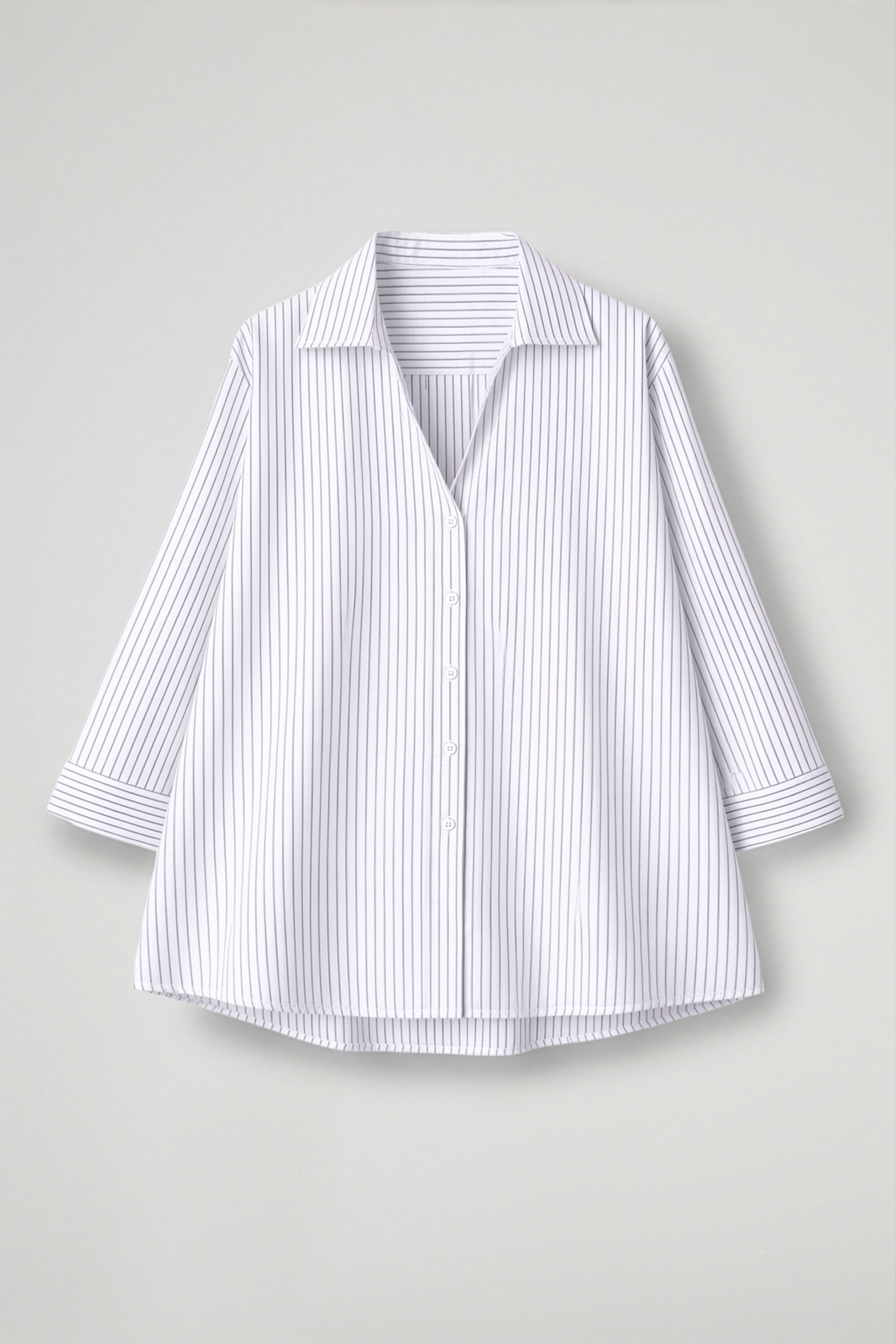 Camicia Over asimmetrica in popelin di cotone , collo classico, scollo a V, spalla scesa, manica lunga con polsino alto con spacchetto, apertura frontale con bottoni, spacchetti sul fondo. Linea Over
