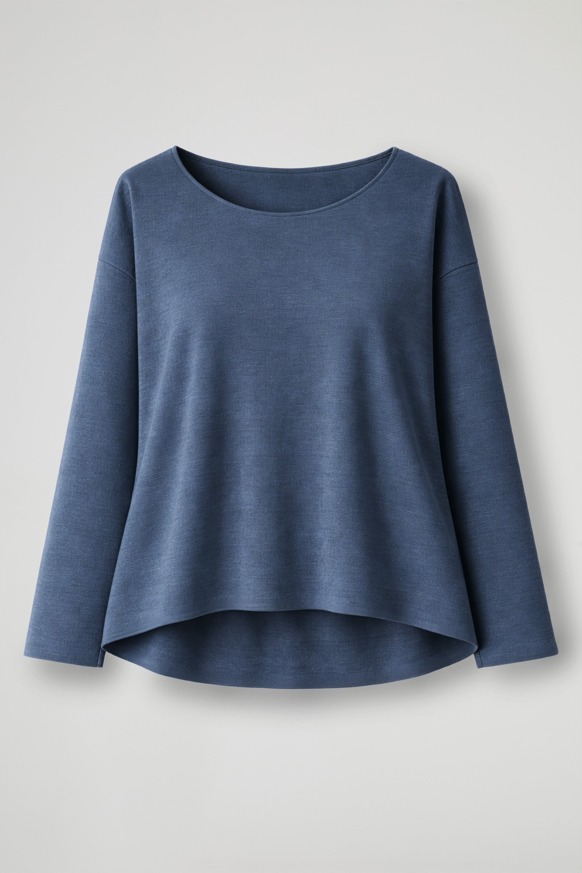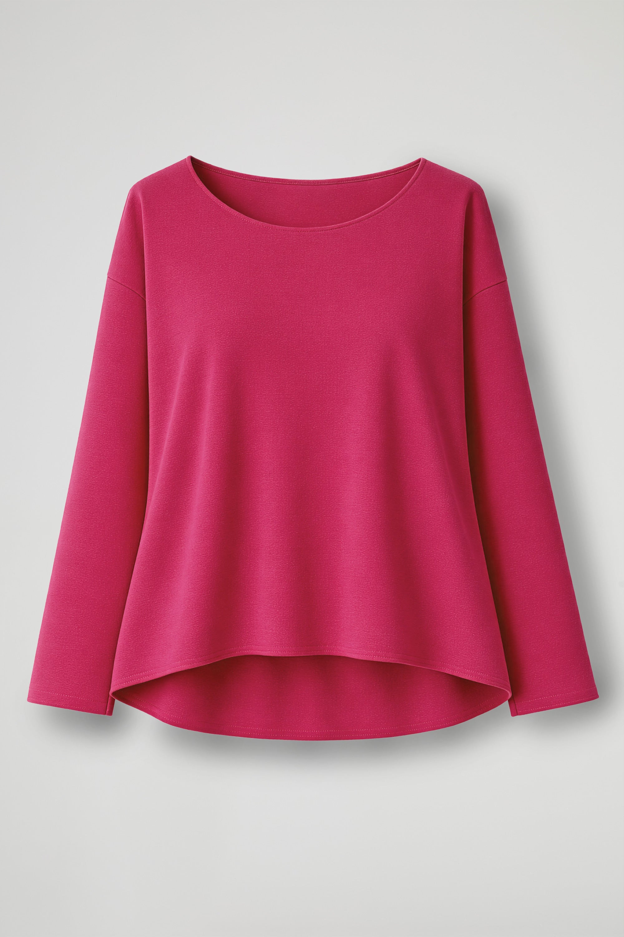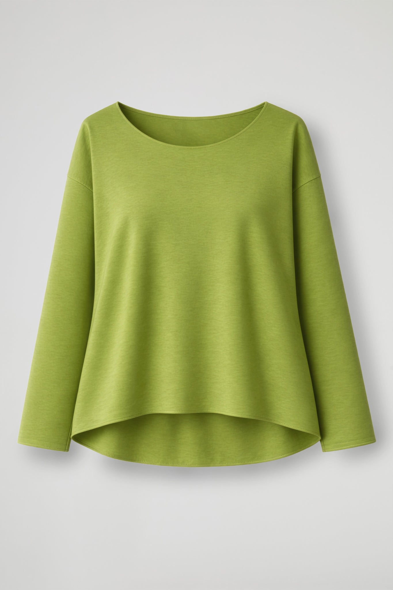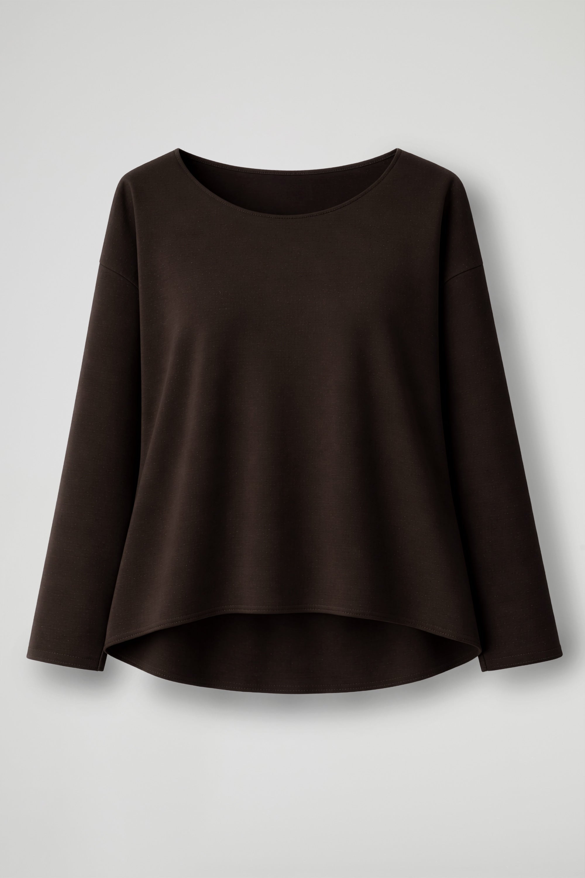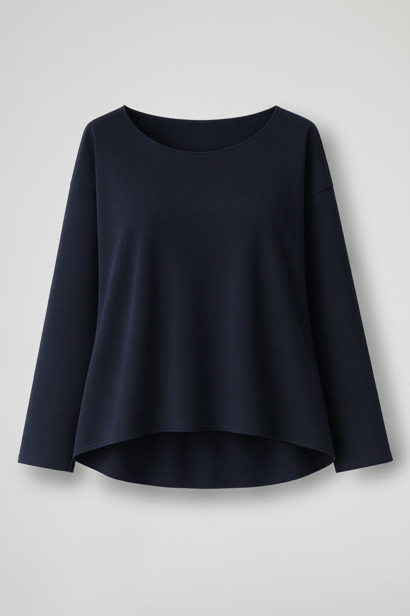 Maglia asimmetrica in tessuto di viscosa, collo ampio , spalle leggermente scese manica lunga, taglio stondato sul fondo. Linea morbida