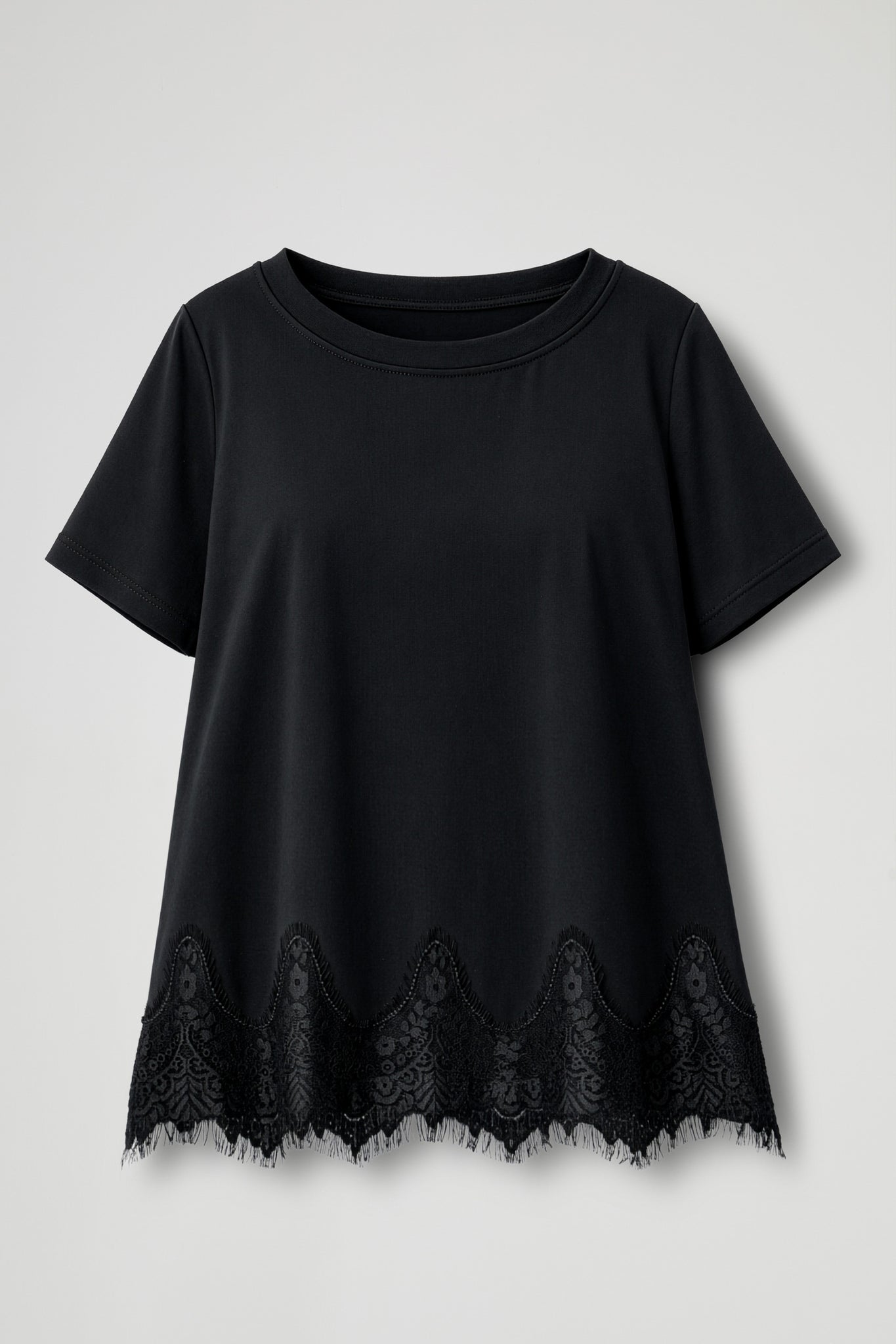 T-shirt dal design minimal arricchita da un 'elegante bordatura in pizzo sul fono che crea un contrasto sofisticato e dona al capo un tocco femminile e ricercato; Il modello presenta girocollo classico e maniche corte, con una linea morbida e confortevole.