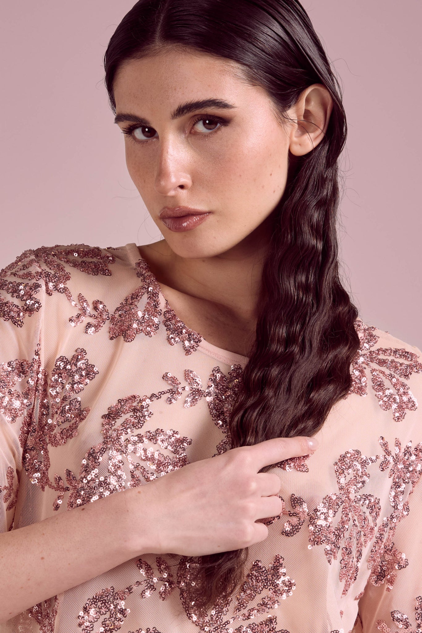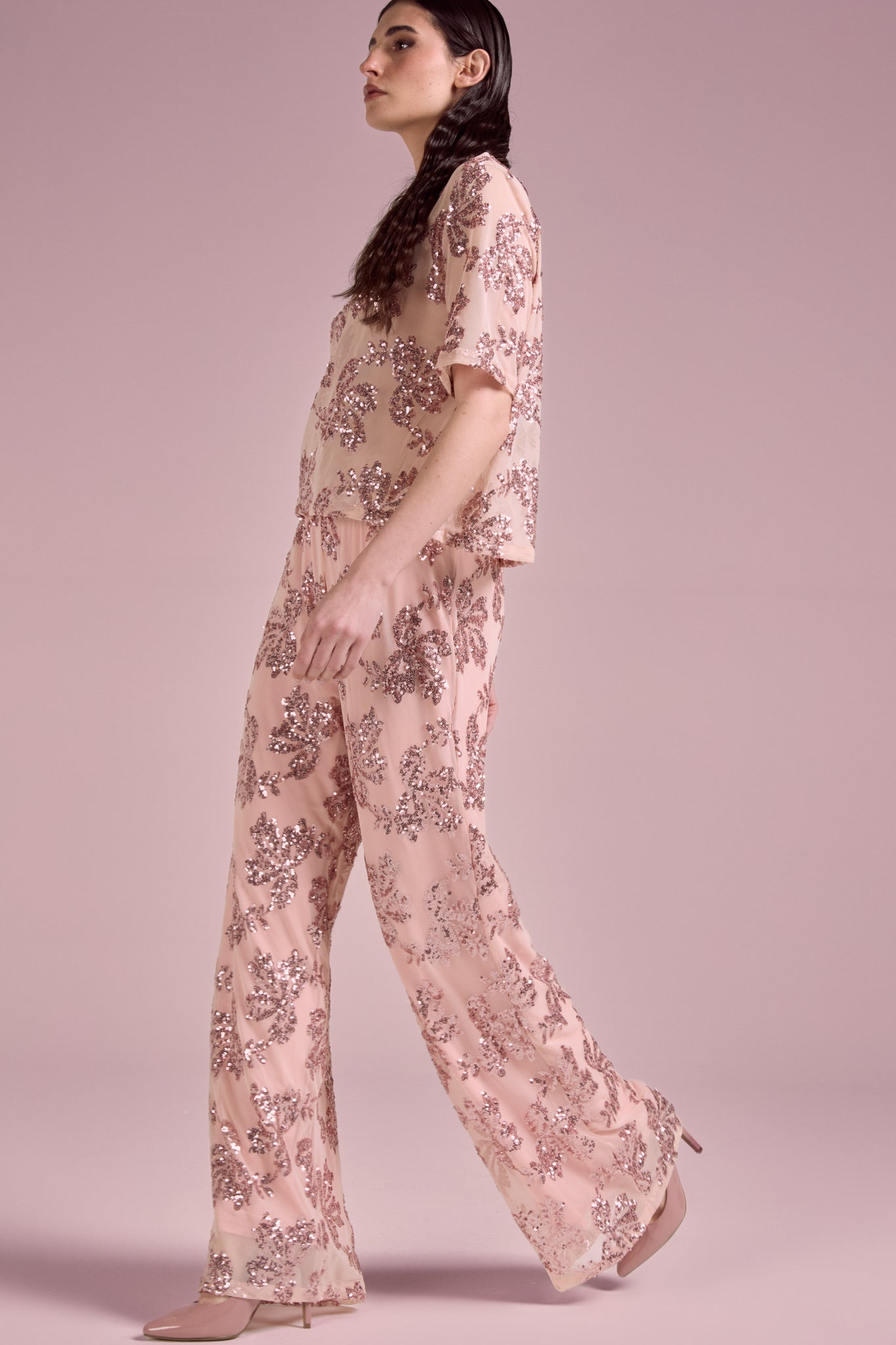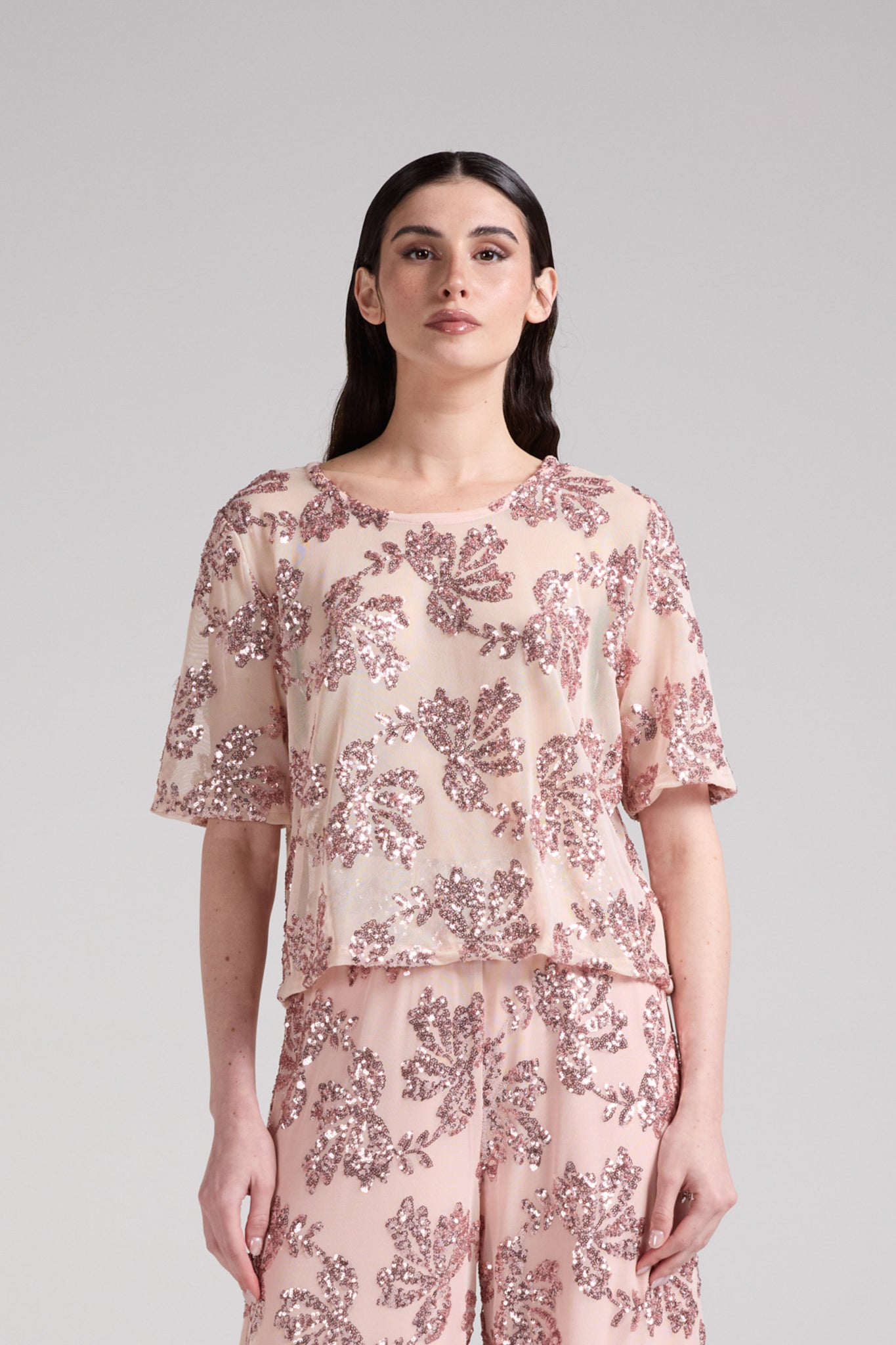 Top elegante dal design luminoso e raffinato, realizzato in tessuto leggero impreziosito da ricami in paillettes con motivo floreale all-over; Il modello presenta una linea morbida e leggermente boxy, con maniche corte e girocollo, per una vestibilità confortevole e contemporanea. La lavorazione ricercata dona brillantezza e rende il capo ideale per occasioni speciali o per creare outfit sofisticati .